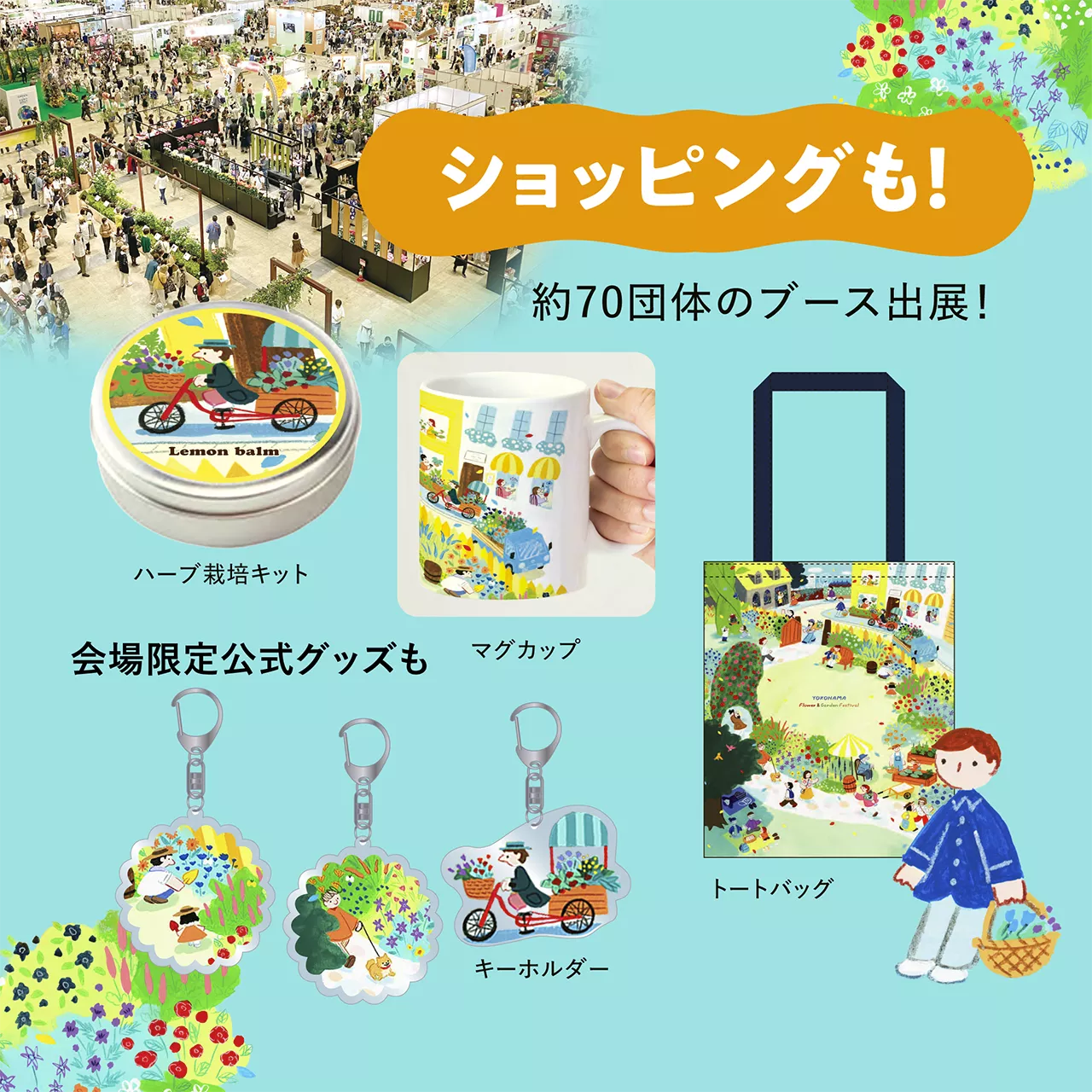イベントのメインビジュアルを手がけるのは、昨年に引き続き、絵本作家の大桃洋祐さん。「園芸の楽しさは、100人100通り」のテーマはそのままに、今回は横浜の街なかの公園の風景を描いてもらいました。思い思いに花と緑を楽しむ人々の賑やかな声が聴こえてきそうな、楽しさ溢れるメインビジュアルです。会場限定販売のオリジナルグッズもお楽しみに!